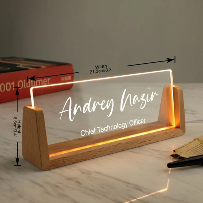 Custom Name Lighted Acrylic Desk Nameplate Modern Office Decor with Wood Base LED Name Sign Gift for New Job Boss Coworkers